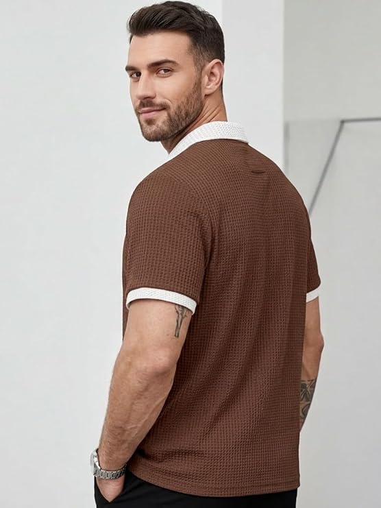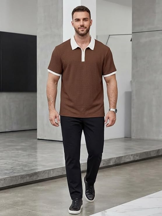 • PREMIUM DESIGN: Waffle knit textured polo t-shirt featuring a modern zip collar and contrasting white trim details for a sophisticated look